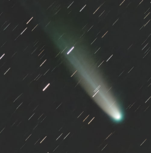 10/23の画像では、イオンの尾とダストの尾が分かれていたが、この日はほぼ重なっている。短くて太い黄色のダストの尾の中に、青みがかって細いイオンの尾が突き抜けている。