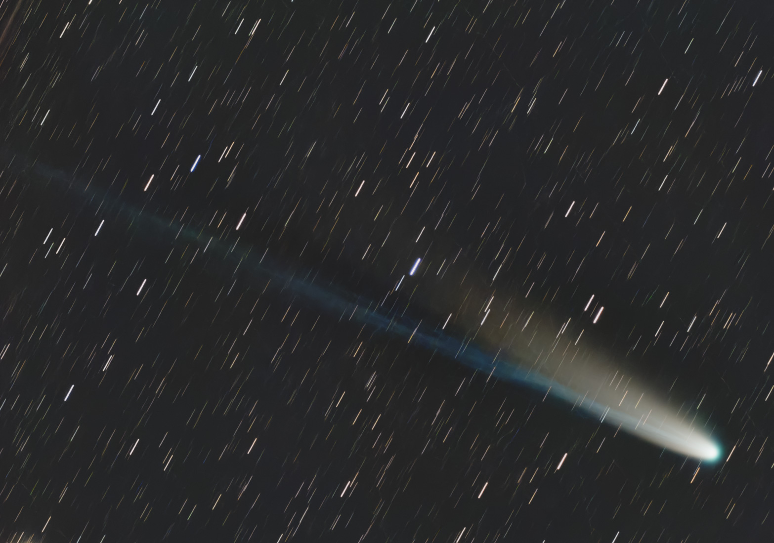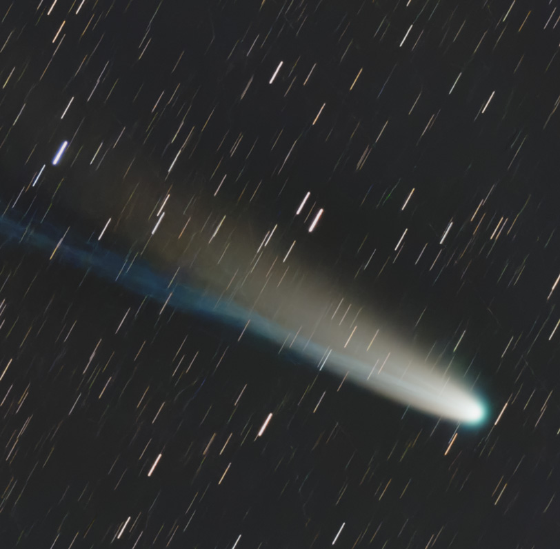 昨日は日没時からほぼ快晴で雲が邪魔になることはなかったが、月齢が12.9と明るく、淡い彗星の尾が写るかどうか心配だった。しかし40分程度露光してスタックすると、長くて青いイオンの尾が浮かび上がってきた。途中で少し折れ曲がっている様子もわかる。黄色いダストの尾、青いイオンの尾、緑がかった核、それぞれの色の対比が美しい。