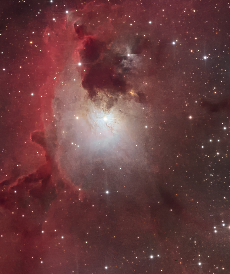 中央の白く光っている反射星雲の周りには、Hαの赤い輝線星雲と黒い暗黒星雲が入り組んで分布しており、まるで現代美術のような混沌とした絵面になっている。
