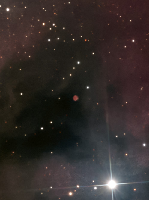 それから、この暗黒星雲の中に変なオレンジ色の星があって、画像処理の失敗かと思ったら、PK260+00 2という、視直径 0.26′ x 0.24’の小さな惑星状星雲だった。