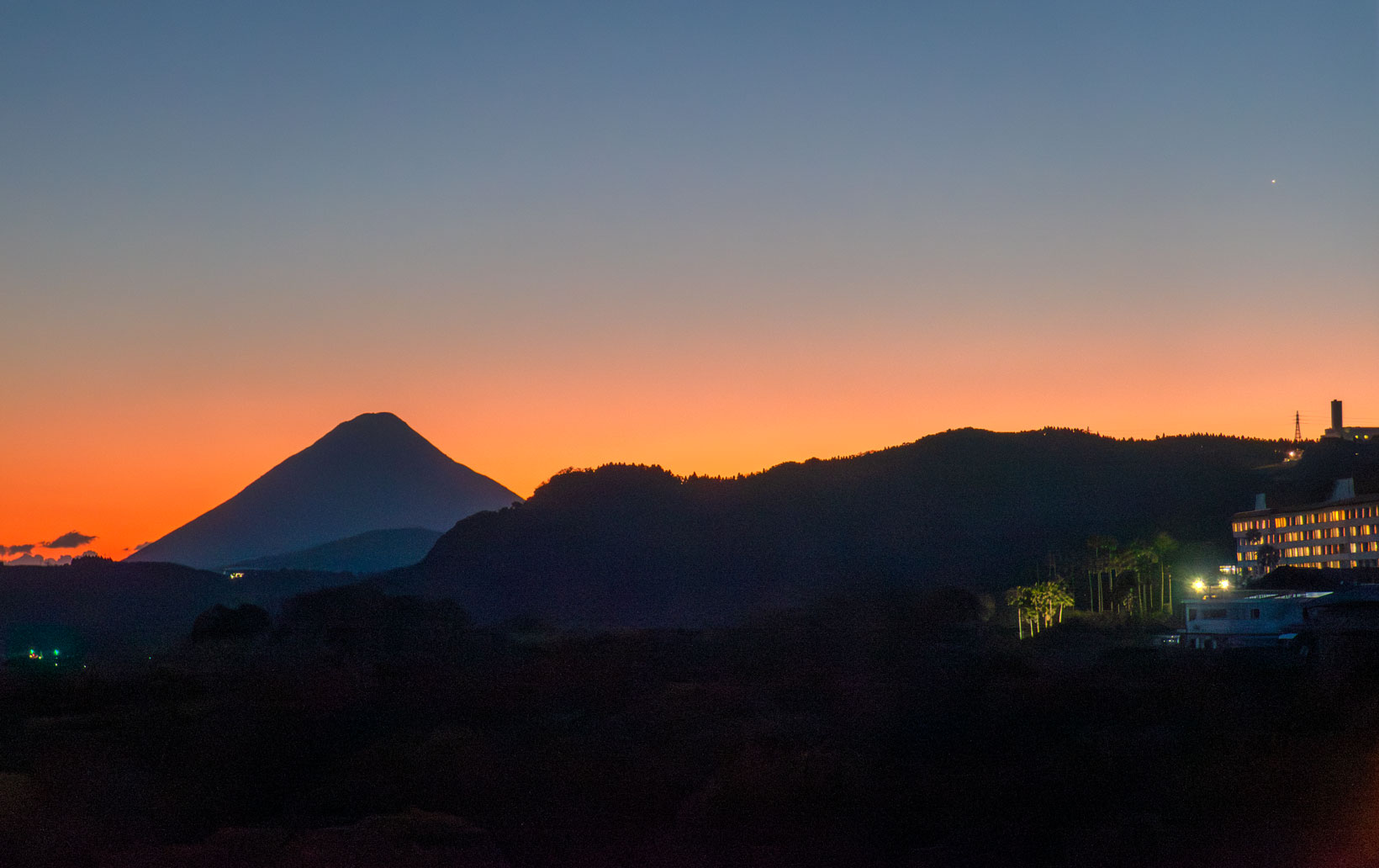 旅行で訪れた指宿のホテルのバルコニーから、夕焼けの中の開聞岳と金星を見ることができた。幸い快晴に恵まれ、整った円錐形の開聞岳が夕焼けをバックにシルエットとして浮かび上がった。金星は少し離れた位置だが、画面右上に見えている。