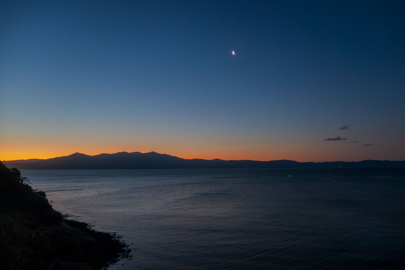 このバルコニーはオーシャンビューで鹿児島湾を見渡せる。翌朝には鹿児島湾を挟んで向かいにある大隅半島の上に、月齢24.4の月を見ることができた。