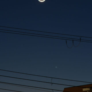 2026/02/19 18:35 水星と月齢1.9の月/明石市Pentax KP, XRリケノン135mm F2.8 -> F4, ISO800, 2.0sec. トリミングあり今日の夕方、西空で月齢1.9の月と水星が縦に並んだ。この時の水星の高度は約7.2°で、近所の建物の上ぎりぎりで、電線の間から見えていた。光度は-0.5等と明るく、肉眼でも楽に見えた。4cm8倍の双眼鏡では月と水星が同一視野に見え、細い月の光っている部分と地球照の対比が美しかった。